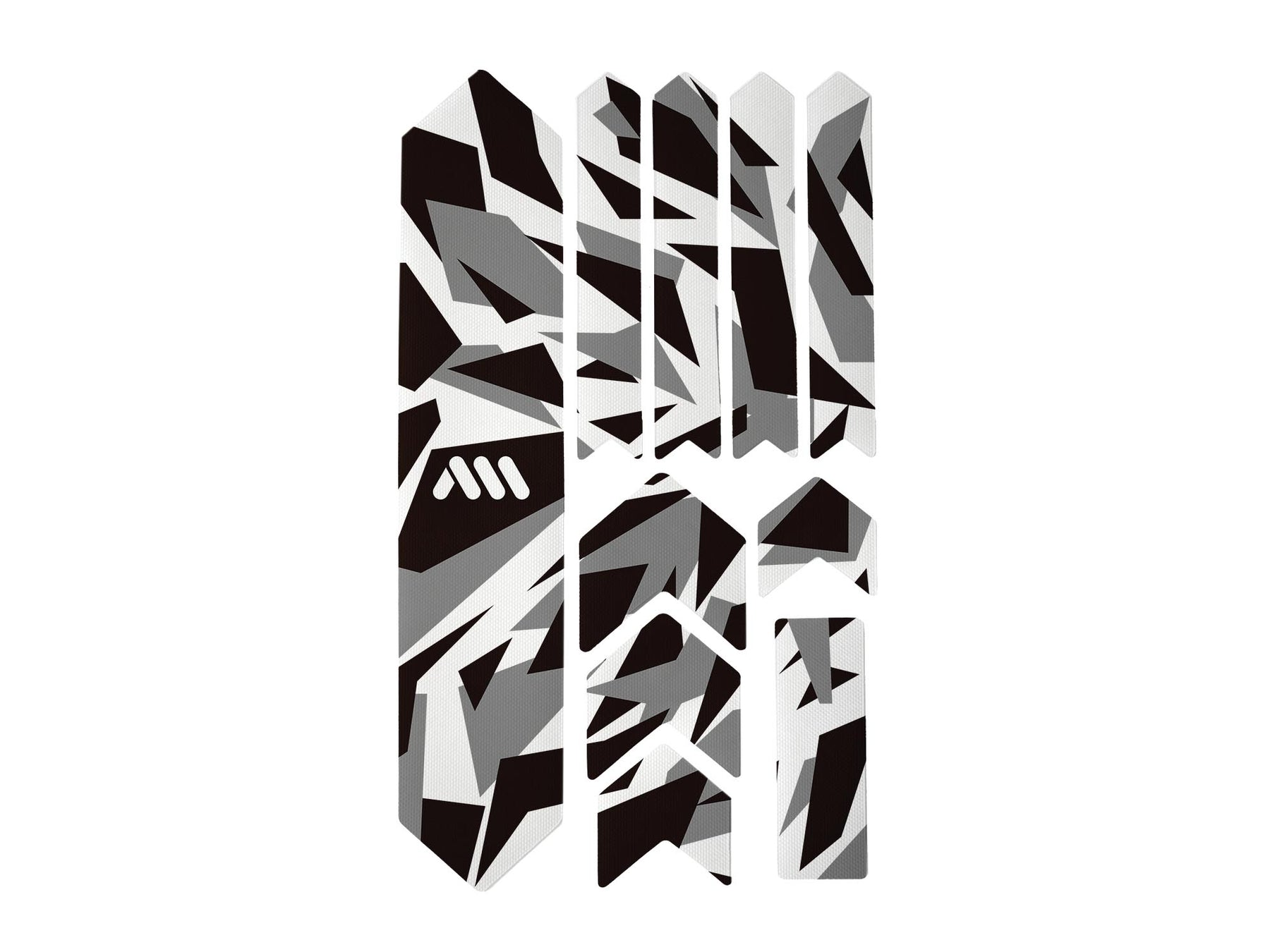 - 10 parts for a universal protection system: 1 big part for the down tube; 4 arrow parts for extending the down tube protection or top tube, 4 parts for the chainstay; 1 rectangle for cable wear protection or other uses.