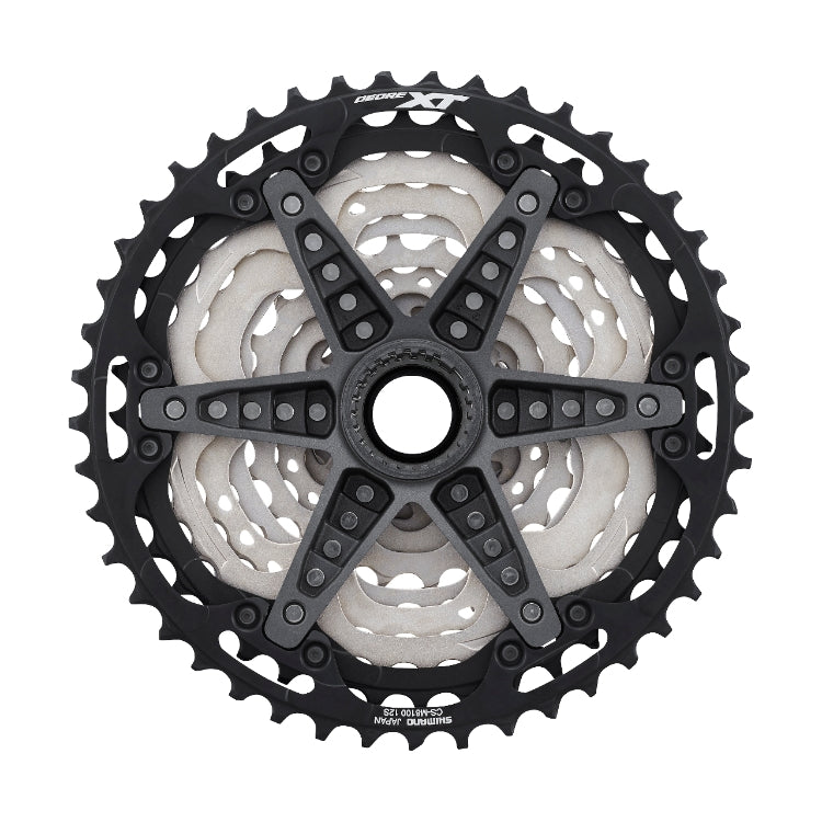 With its BEAM SPIDER construction, the new SHIMANO DEORE XT M8100 12-speed cassette shaves weight while increasing SHIMANO's MTB gearing range another gear. Using SHIMANO's new MICRO SPLINE freehub body and HYPERGLIDE+ tooth profile, these 10-45 and 10-51T cassettes deliver advanced shifting performance.